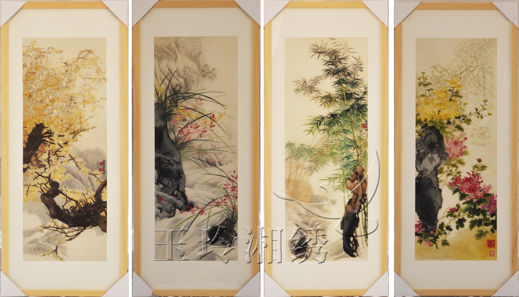 梅蘭竹菊條屏 梅蘭竹菊條屏 產品貨號3782 產品尺寸帶框:105*45(cm) 框架材質 產品類別單面繡條屏 咨詢電話400-0731-100 產品介紹 湘繡 梅蘭竹菊條屏 分享按鈕 更多單面繡條屏 您可能喜歡 和平 觀音 花鳥 冰清玉潔 春風得意 扇形宋畫 花鳥畫 和諧圖