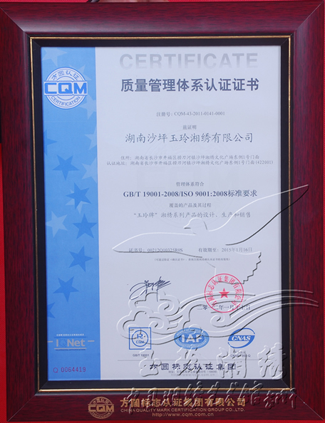 玉玲湘繡通過GB/T 19001-2008/ISO9001:2008質(zhì)量認(rèn)證